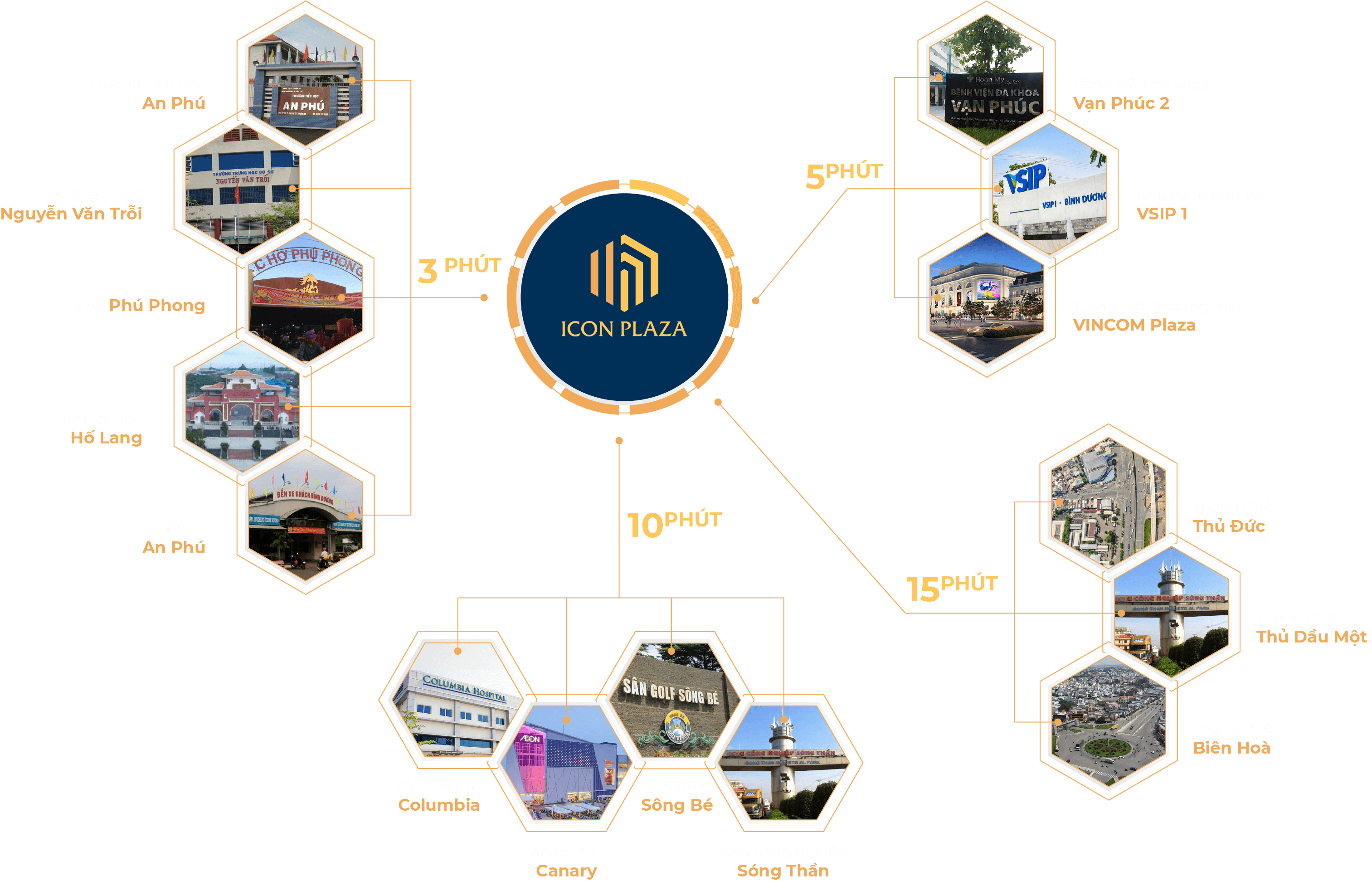 Ở vị trí này, cư dân Icon Plaza dễ dàng kết nối đến các khu vực kinh tế trọng điểm của Bình Dương chỉ từ 5-15 phút như; Aeon Mall, Vincom Dĩ An, Lotte Mart, Bệnh viện quốc tế Columbia, VSIP 1,…..